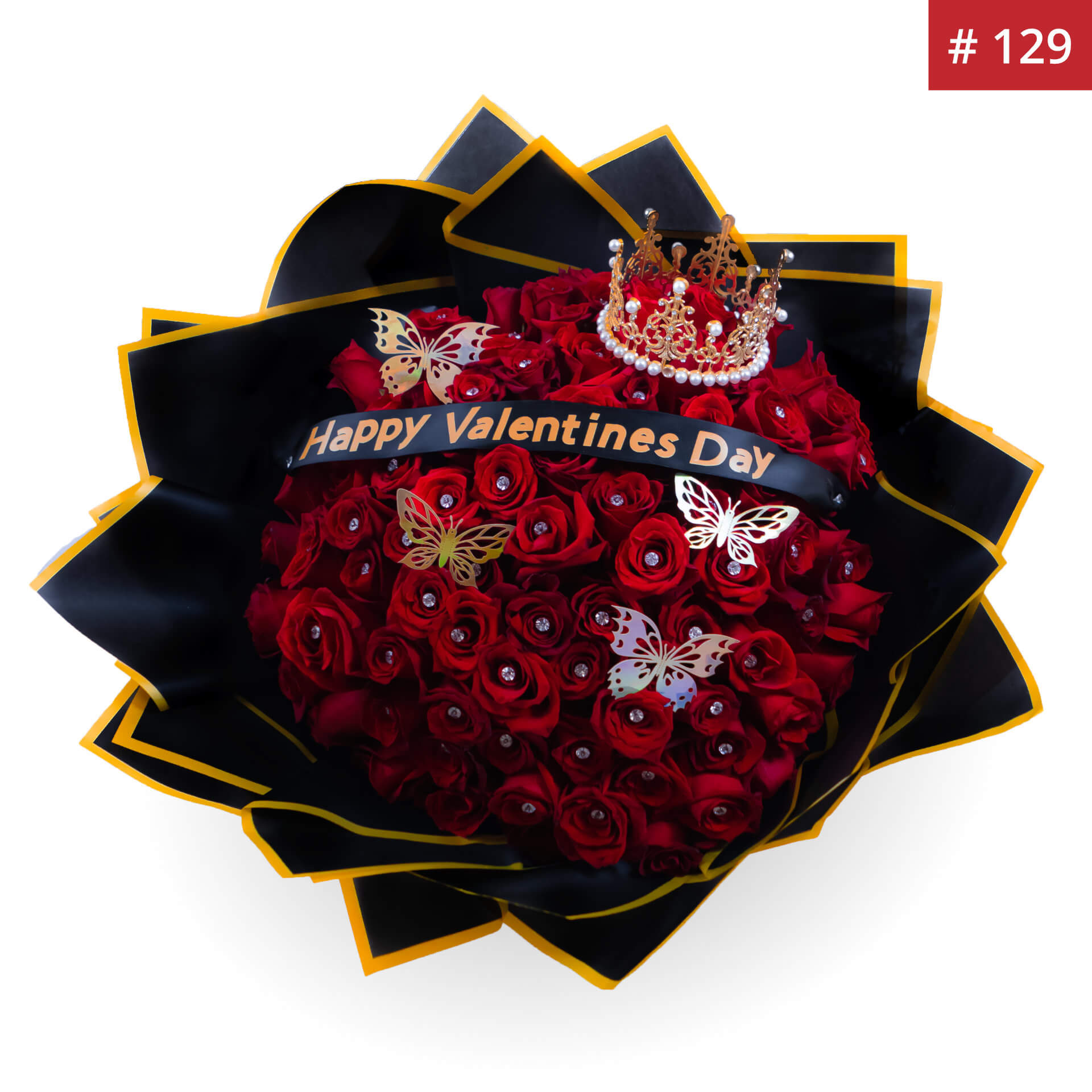 An extravagant arrangement of 100 red roses, crowned with regal detail, butterflies, and shimmering accents. Bold, romantic, and unforgettable.