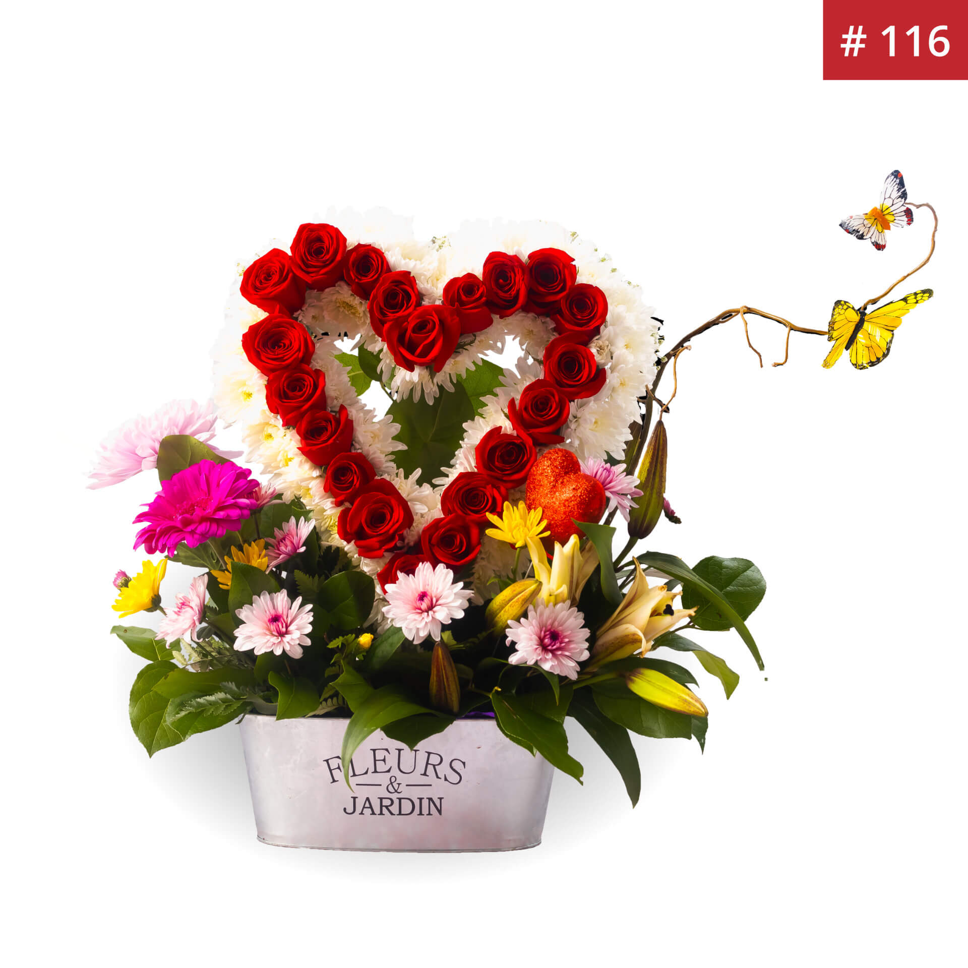 This stunning floral arrangement showcases a heart-shaped design of elegant roses or carnations, framed by soft white blooms. A vibrant mix of daisies, lilies, and gerbera daisies adds a lively, romantic touch. Presented in a rustic Fleurs & Jardin metal container with a glittery heart accent, it’s the perfect gift for Valentine’s Day, anniversaries, or any special occasion.