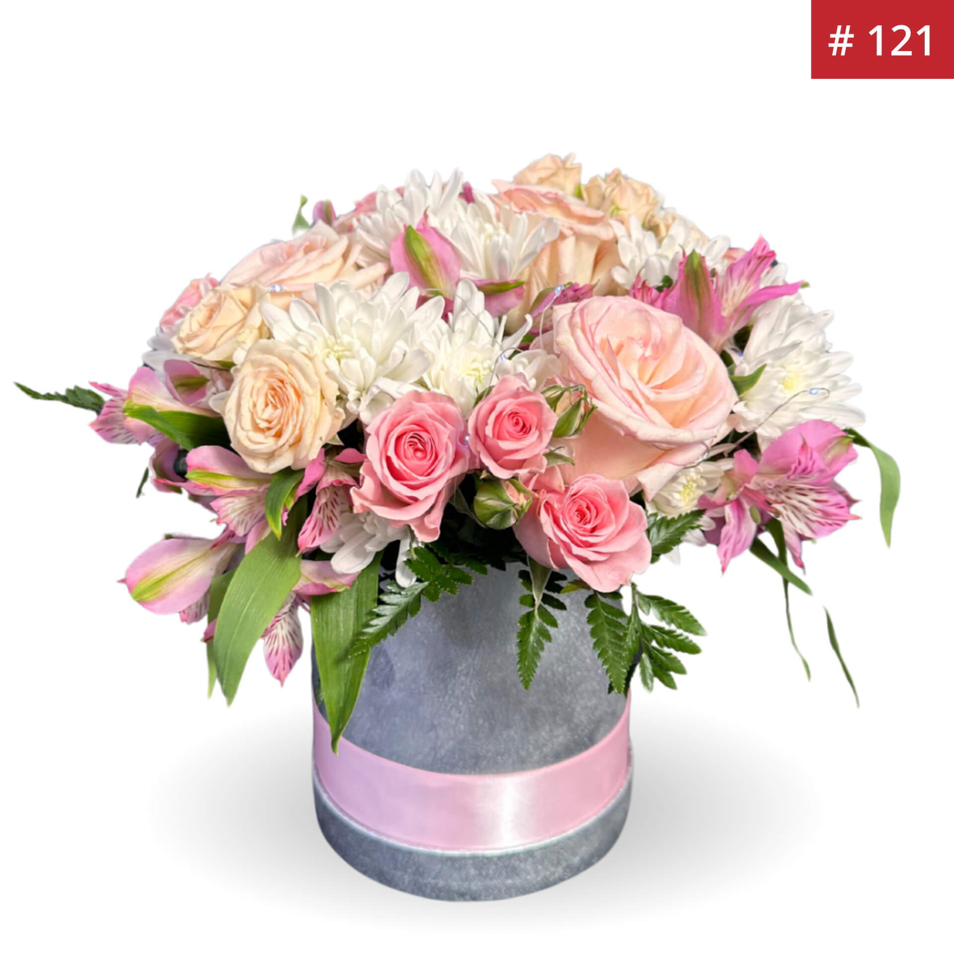 A graceful bouquet of pastel roses, pink lilies, and soft-hued chrysanthemums, delicately accented with lush greenery. This serene blend of pinks and whites offers a heartfelt expression of love, gratitude, and timeless beauty.